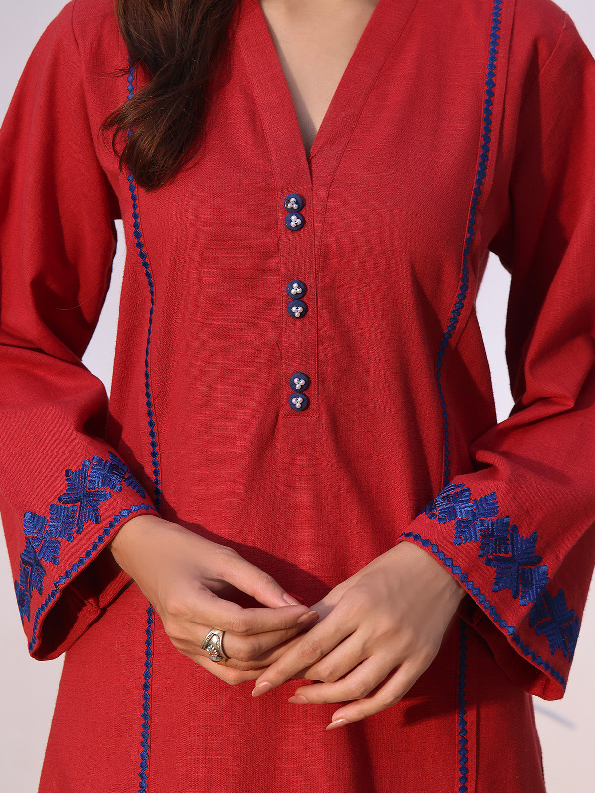 • 2Pc Solid Embroidered Pret Shirt Trouser Khaddar Red - OWE2P-2408001