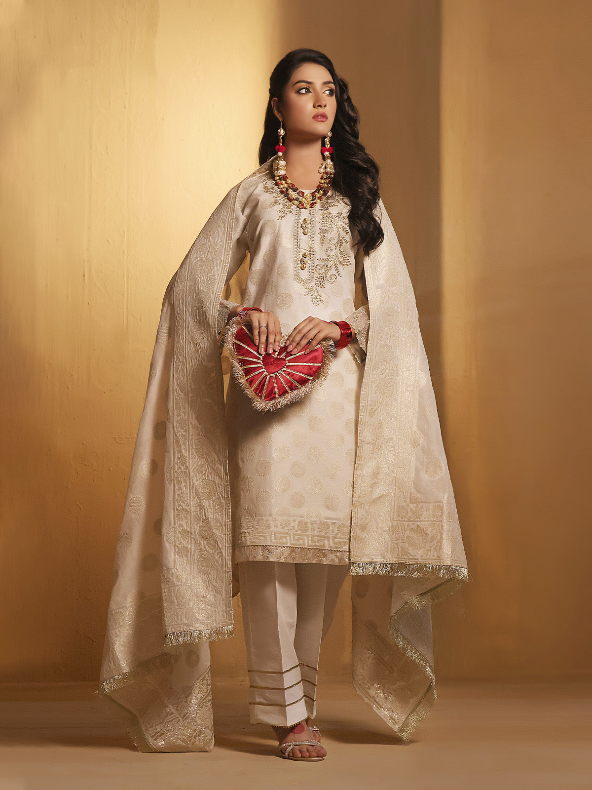 3Pc Embroidered Suit Pret Jacquard Cream - OWE3P-2303002