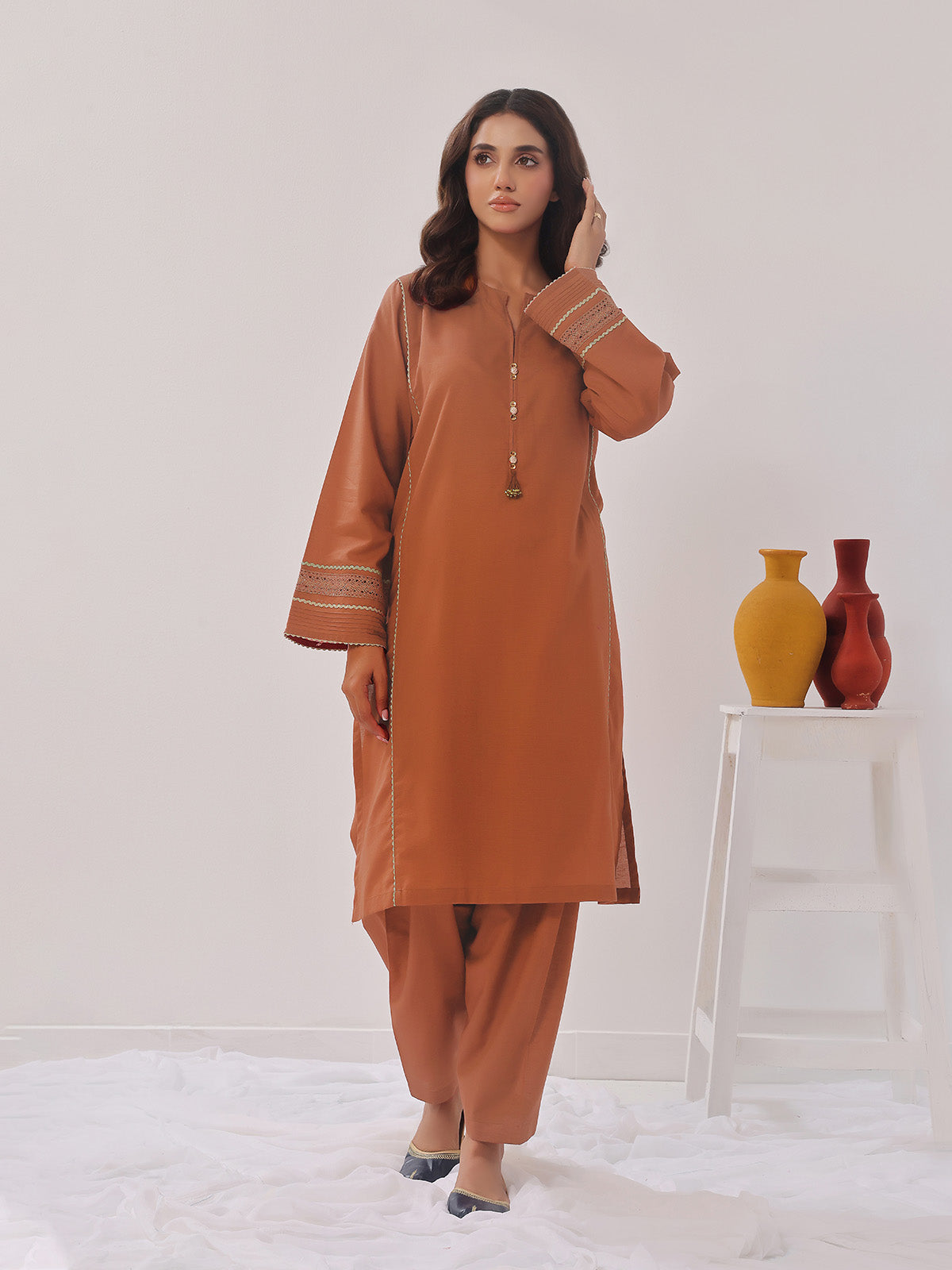 2PCs Solid Pret Shirt Trouser Cotton Texture Brown - OW2PG-2407007