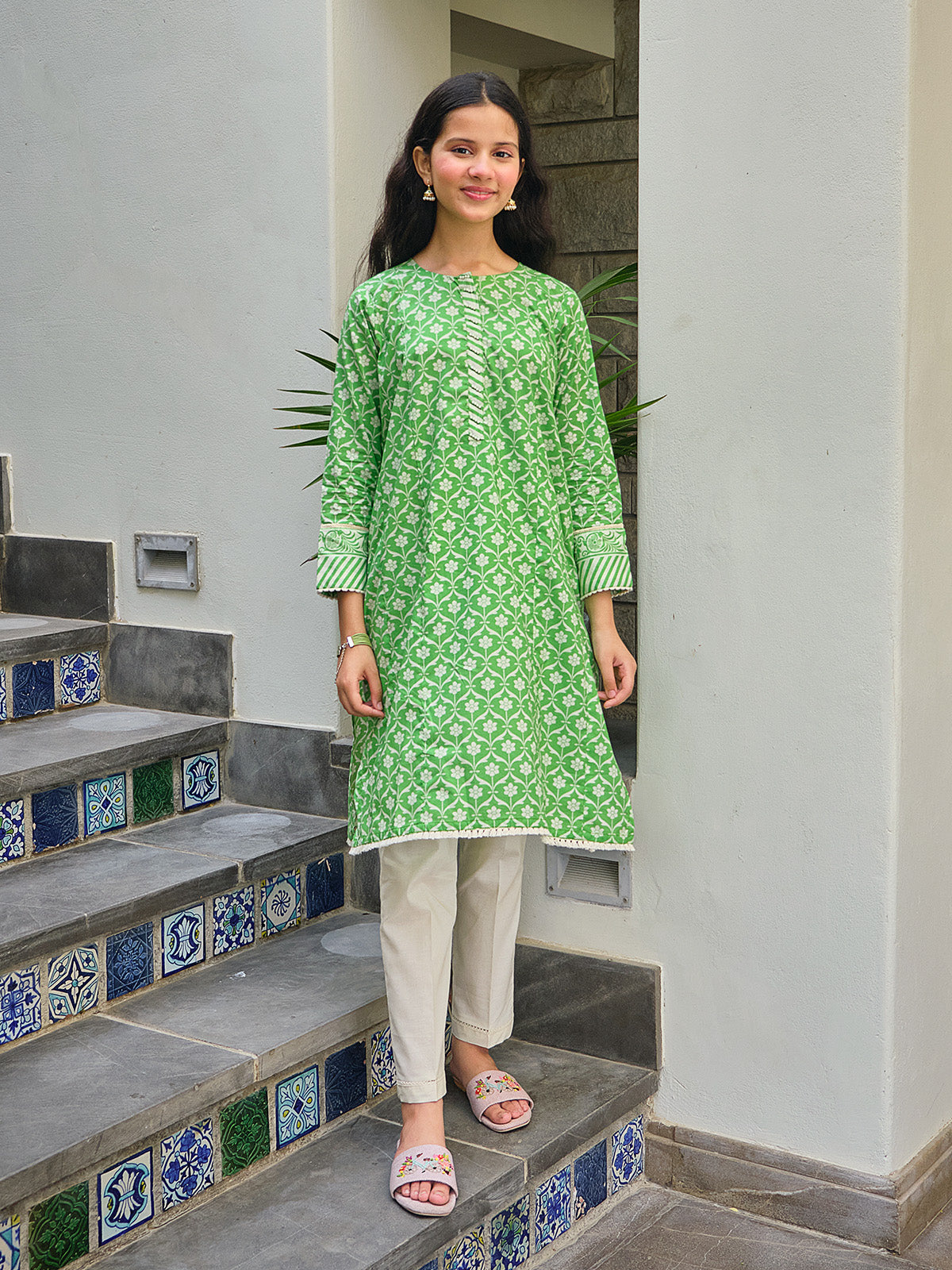 1Pc Printed Pret Kurti Lawn Green - OGKT-2304001