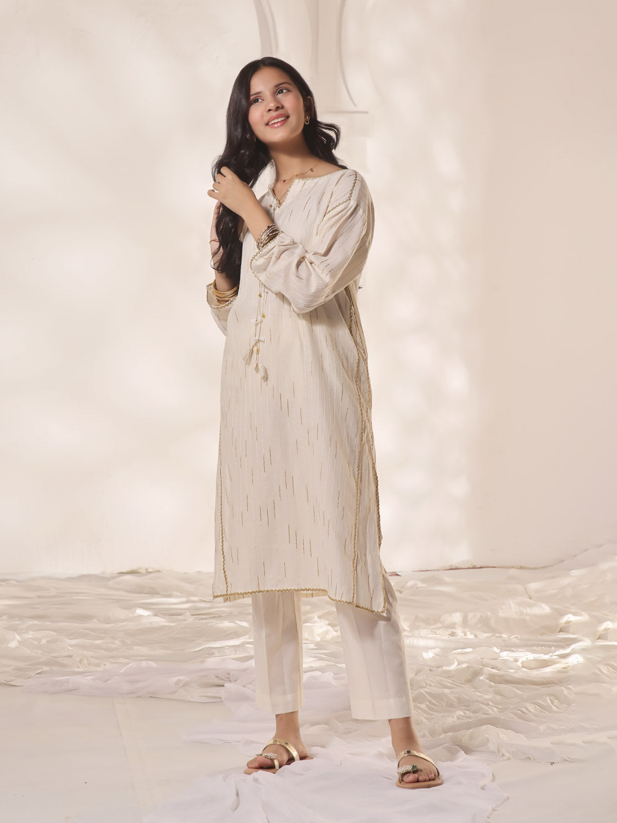 2Pc Fancy Pret Shirt Trouser Dobby Cream & Golden - OG2PG-2309010