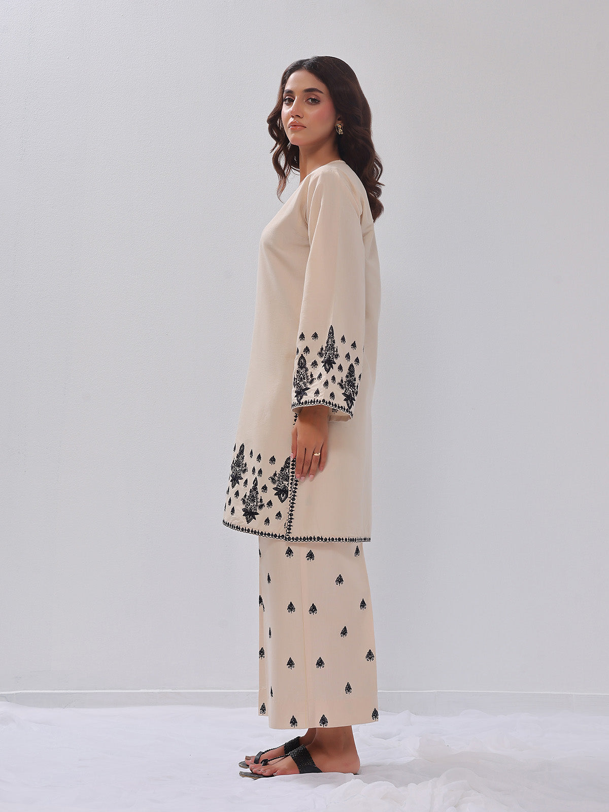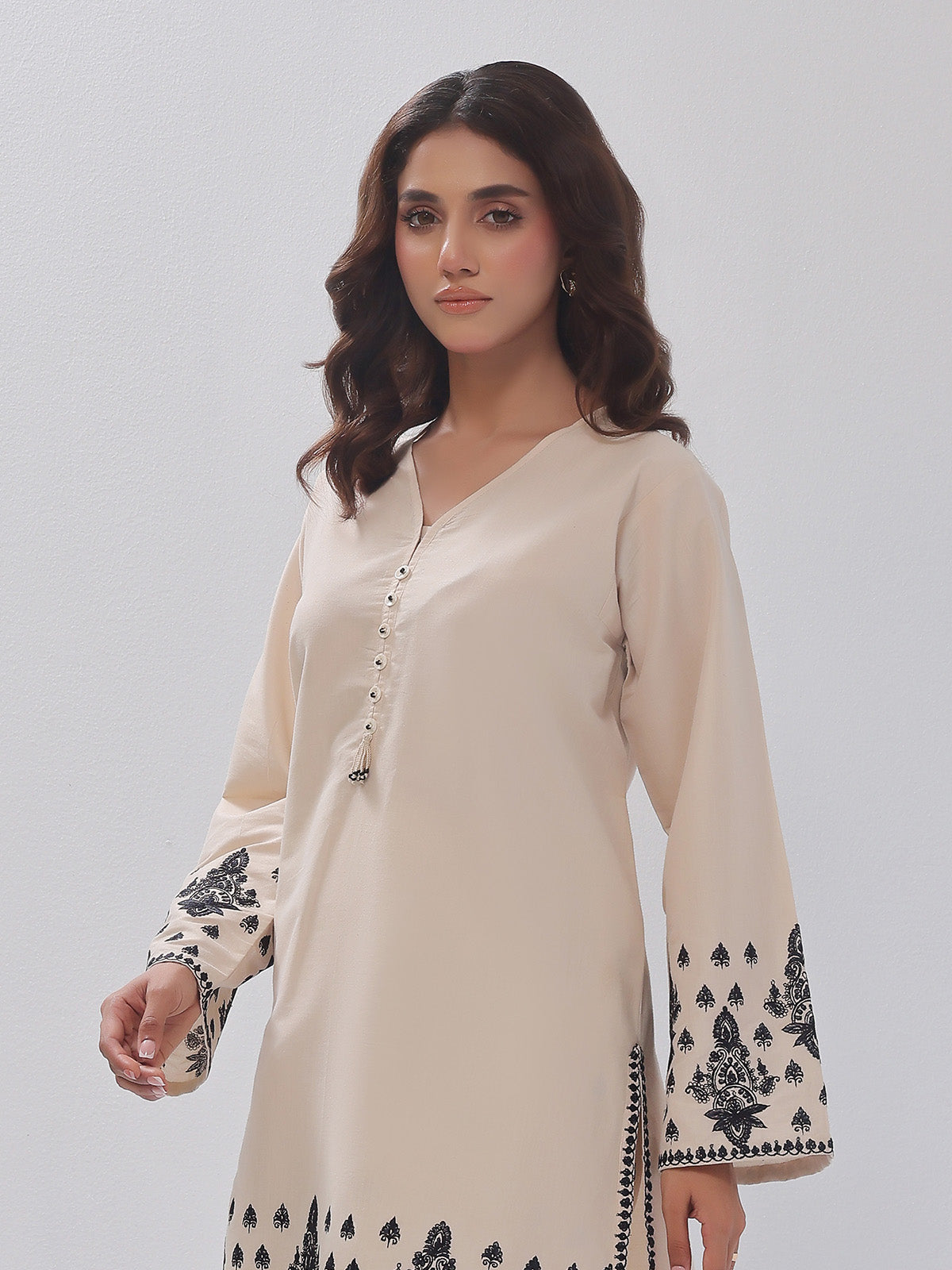 2Pc Embroidered Pret Shirt Trouser Cotton Silk Beige - OWE2PG-2405034