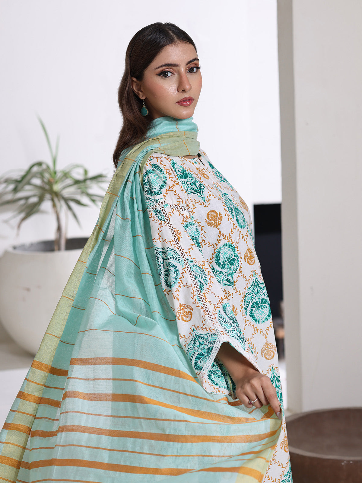 3Pc Screen Print Pret Suit Cambric White & Ferozi - OW3P-2508019
