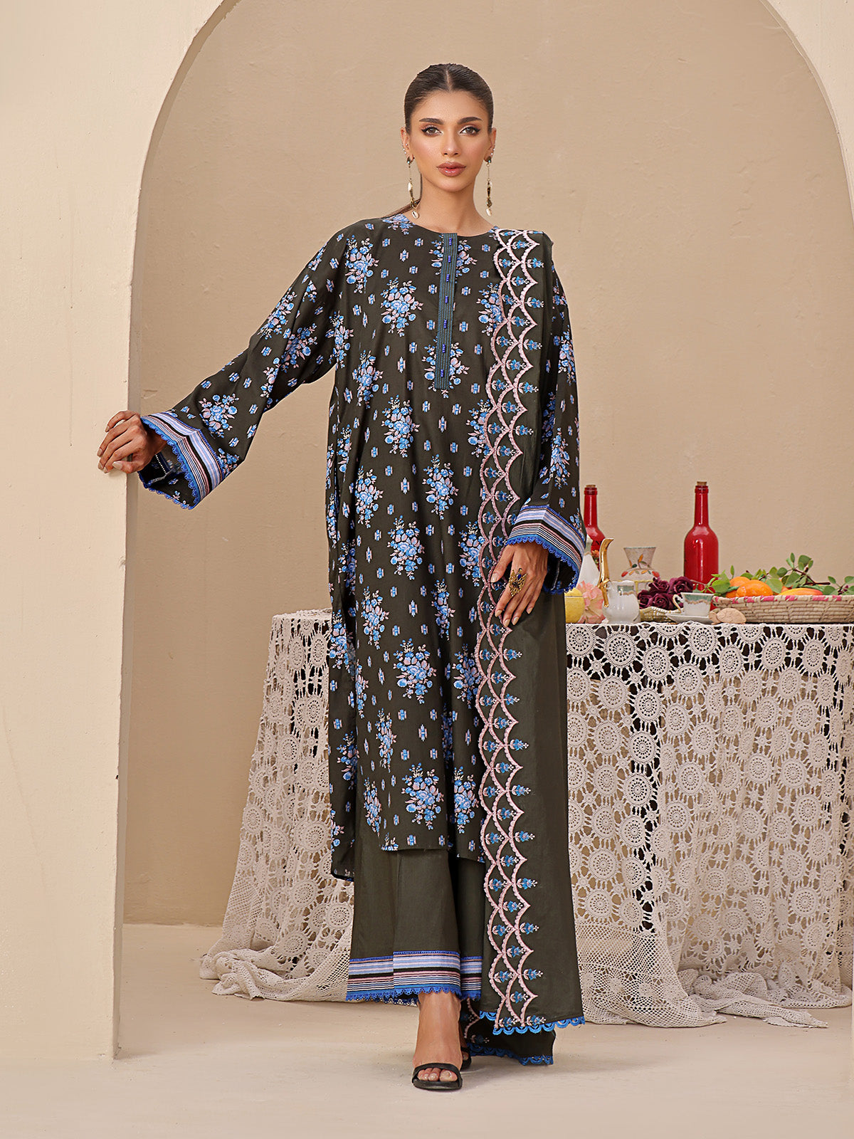 Shirt Fabric: Dobby (2.3 Metre) Season: Summer Front: Printed Sleeves: Printed Dupatta: Lawn Embroidered (2.5 Metre) Trouser: Dyed cambric (2 Metre) Pieces: 3PCs