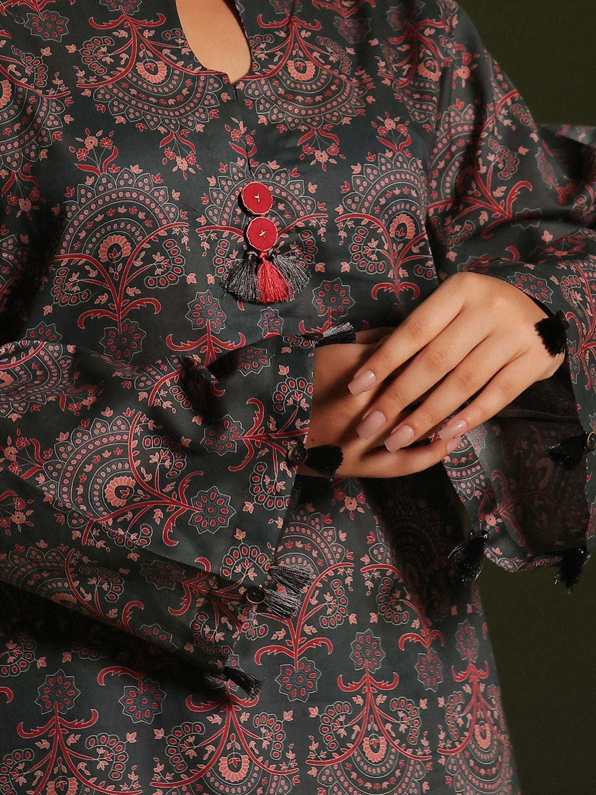 2Pc Printed Pret Shirt Trouser Cambric Dark Green - OW2P-2411002